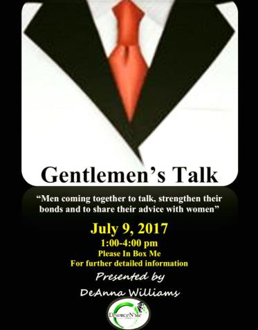 July 9 2017 Gentlemen’s Talk Event Pictures . This slideshow requires JavaScript. . Guest Line Up Click on a name for details . Ms. DeAnna Williams BIO – Speaker . Mr. Thomas Cotton BIO – Speaker . Mr. Khalid Scott BIO – Speaker . Mr. Nolen James BIO – Speaker .